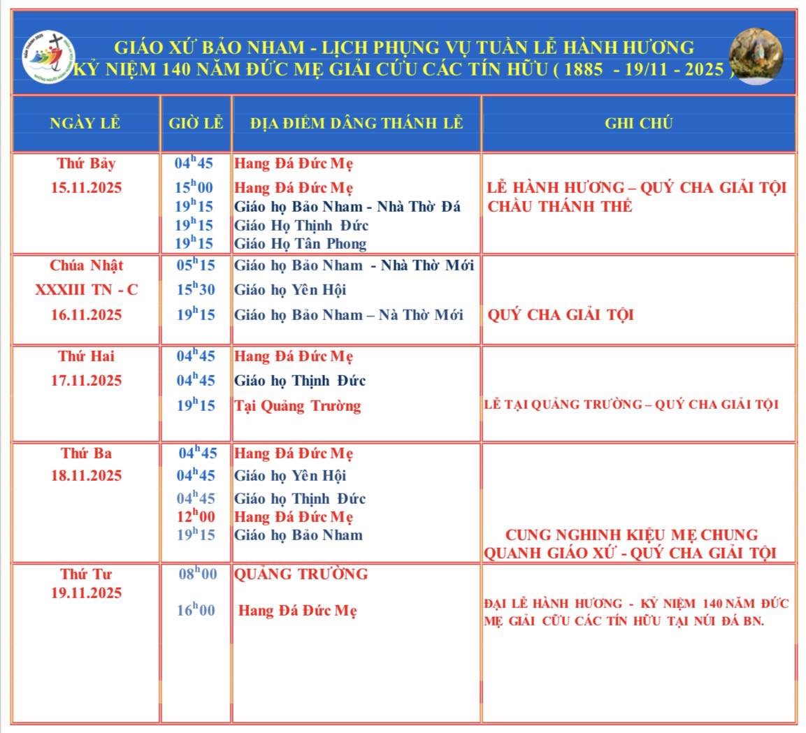 LỊCH PHỤNG VỤ TUẦN LỄ HÀNH HƯƠNG