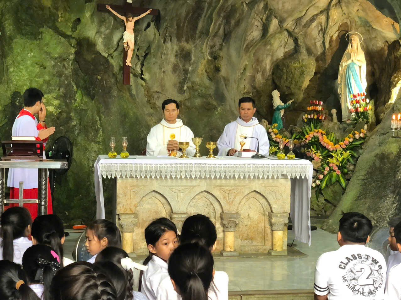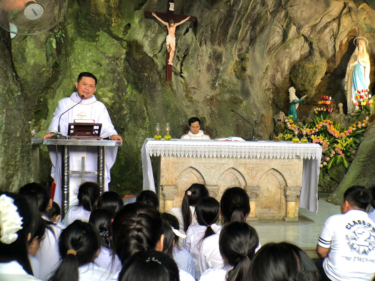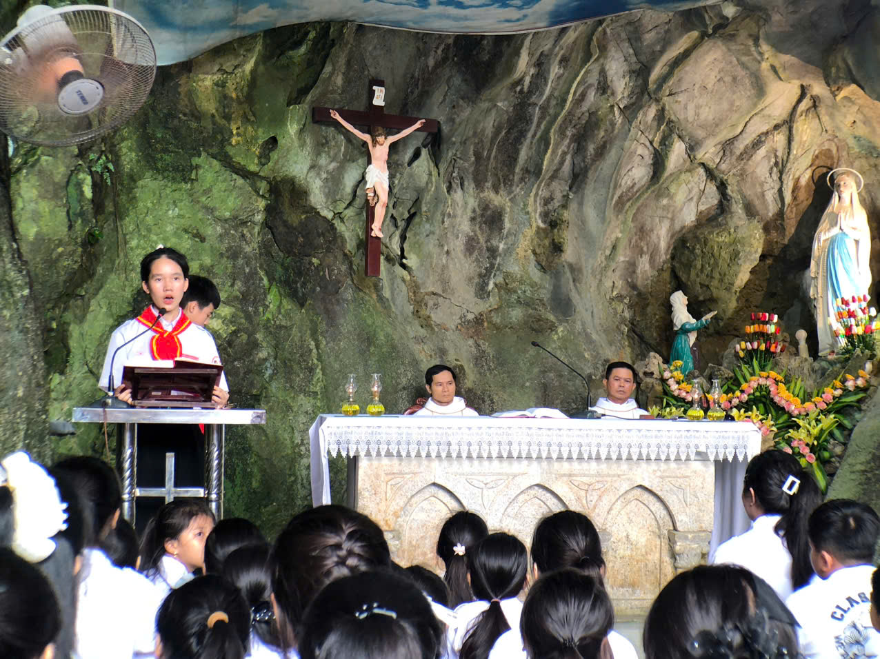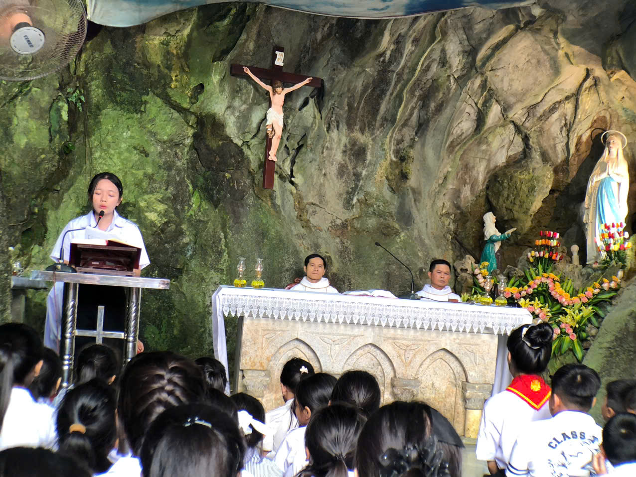Lúc 7h30, Hội đoàn Legio khởi đầu hành hương bằng việc suy ngắm 14 chặng Đàng Thánh Giá trên Núi Đá, sau đó cùng Xứ đoàn Donbosco hiệp dâng Thánh lễ tại Hang đá Đức Mẹ vào lúc 9h00.